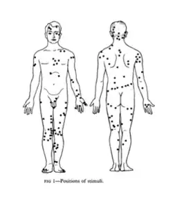 The term mitempfindungen (literally "associated sensations") was first used in 1844 by the German scientist Johannes Müller.[22] "Referred itch" was only used after 1884, in context to the research of Russian physiologist N. Kowalewsky. The phenomenon of referred itch was documented as early as 1733. Around that time, the English scientist Stephen Hales observed that when an area of the body was scratched by the nails, an itching sensation could be triggered on a distant part of the body. He had called the phenomenon the many "Instances of the Sympathy of the Nerves."[23] More extensive observations on the referral of sensation were documented by Kowalewsky, who observed referred sensations on himself. Kowalewsky published his findings in 1884.