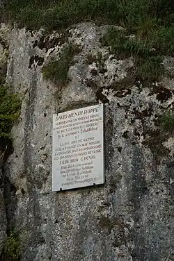 The first 'meeting' took place in the open air near Regensburg in what is now the Max-Schultze-Steig nature reserve. The location was adjacent to prominent cliffs with a cave above the river Danube that provides some shelter and was subsequently called the 'Hoppefelsen' in memory of Hoppe. He walked there accompanied by his friends Ernst Wilhelm Martius, Johann August Stallknecht and Heinrich Christian Funck, all pharmacists, and then read a statement of the aims and rules of the new Regensburg Botanical Society. Several prominent local people soon joined, including two Frenchmen, Charles François Marie Duval and François Gabriel de Bray, the French ambassador to Regensburg.[3][4]
