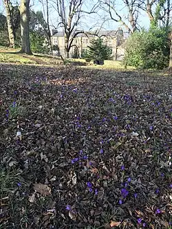 The layout is broadly divided into a large 2.8-hectare (7-acre) area with six distinct lawns and a smaller 2-hectare (5-acre) area of woodland. The lawns are surrounded with several different species of trees, including an avenue of lime trees, and a series of horse chestnuts along a ha-ha near the Calton Hill boundary wall at the top of the grounds. Various paths covered by trees surround the large lawn area. The woodland area is planted with snowdrops, crocuses, daffodils and bluebells.[1][5]