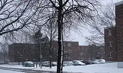 Regent Park—and adjoining areas of the Old City's east end—were home to some of Toronto's historic slum districts in the early 1900s. Most residents of the area were poor and working-class people of British and Irish descent, along with smaller numbers of continental European Jewish and Macedonian immigrants. Concern over crime and social problems in the area, as well as substandard housing, led to plans for affordable housing during the Second World War.[1] These plans came to fruition soon after the end of the war, when the Regent Park North public housing project was approved in 1947. Families began to move into Regent Park North in 1949, but construction continued into the 1950s. The last families moved into Regent Park North in 1957. In subsequent years, more public housing units were built in Toronto, including Regent Park South, which was completed in 1960. The high-rise portion was designed by Page and Steele while the spartan row house and walk-up apartments were designed by John Edward Hoare.[2]