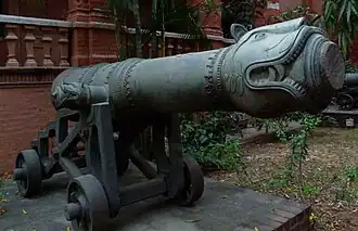 The Mughal Emperor Babur is popularly credited with introducing artillery to India, in the Battle of Panipat in 1526, where he decisively used gunpowder firearms and field artillery to defeat the much larger army of Ibrahim Lodhi, the ruler of the Delhi Sultanate, thus not just laying the foundation of the Mughal Empire but also setting a precedent for all future battles in the subcontinent. However, evidence of earlier use of guns by Bahmani kings in the battle of Adoni in 1368 and King Mohammed Shah of Gujarat in the fifteenth century have been recorded.[3] Then came the Portuguese, who for the first time introduced the man-o-war (ships) armed with cannons and introduced the concept of command of the seas in the Indian Ocean region. However, it was documented by Portuguese travellers that artillery guns were widely in use in the Indian subcontinent.[4] By the early 16th century, Zamorin, the ruler of Calicut, had begun to emulate the Portuguese and began to arm his ships with naval gun pieces.[5]