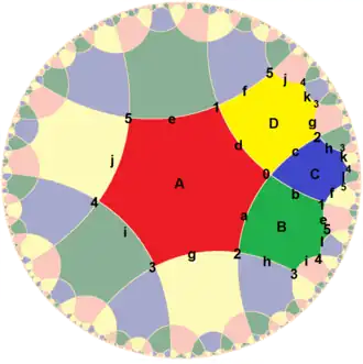 Five such regular abstract polyhedra, which can not be realised faithfully, were identified by H. S. M. Coxeter in his book Regular Polytopes (1977) and again by J. M. Wills in his paper "The combinatorially regular polyhedra of index 2" (1987). All five have C2×S5 symmetry but can only be realised with half the symmetry, that is C2×A5 or icosahedral symmetry.[9][10][11] They are all topologically equivalent to toroids. Their construction, by arranging n faces around each vertex, can be repeated indefinitely as tilings of the hyperbolic plane. In the diagrams below, the hyperbolic tiling images have colors corresponding to those of the polyhedra images.