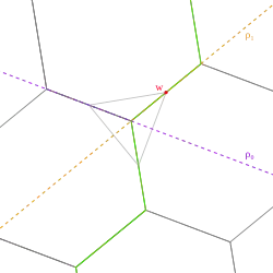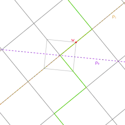 The apeir operation takes the generating mirrors of the polygon, ρ0 and ρ1, and uses them as the mirrors for the vertex figure of a polyhedron, the new vertex mirror w is then a point located where the initial vertex of the polygon (or anywhere on the mirror ρ1 other than its intersection with ρ0). The new initial vertex is placed at the intersection of the mirrors ρ0 and ρ1. Thus the apeir polyhedron is generated by ⟨w, ρ0, ρ0⟩.[12]