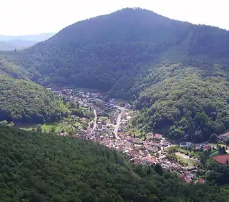 It lies two kilometres south of the town of Annweiler and has an observation tower at the summit named the Rehberg tower after the hill.[3] The tower offers visitors an unhindered panoramic view over large parts of the Palatine Forest and Upper Rhine Plain as far as the hill chains of the Odenwald, Black Forest and Vosges.