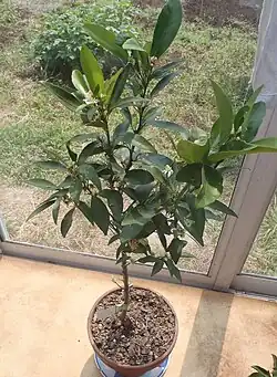 The fruit can be easily peeled by hand.[3] It has a sugar content of between 12% and 13%, with some fruits reaching 15%.[3] The fruit weighs around 210 grams (7.4 oz), relatively large for a tangor, and is a reddish-orange colour.[1] It fruits in late January.[1] It does not produce pollen, so it must be pollinated by another species of citrus.[1]