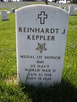 When a Japanese bomber crashed into his ship on November 12, 1942, at the beginning of the Naval Battle of Guadalcanal, he assisted in caring for the resulting casualties. That night and into the early morning of November 13, as the San Francisco participated in a chaotic battle with enemy warships, he labored valiantly, despite mortal wounds, to save his ship and wounded shipmates. (His tombstone incorrectly lists Nov 15 as his death.) It was for his "extraordinary heroism and distinguished courage" on these occasions that Keppler was posthumously awarded the Medal of Honor.[1] Keppler was initially buried at the American Military Cemetery at Espiritu Santo, Vanuatu; his remains were transferred in June 1948 to Golden Gate National Cemetery in San Bruno, California.[1] He was survived by his widow and younger brother Ben (who grew up in Hosmer).