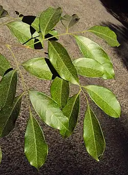 The leaf is imparipinnate, characterized by a slender rachis measuring 4.2 to 11.5 cm (1.7 to 4.5 in) in length. It exhibits a swelling at its base, and is devoid of hairs. The leaf comprises 5–9 alternate leaflets, with each leaflet lacking stipules. Leaflets are attached to a slender petiolule measuring 5 to 8 mm (0.20 to 0.31 in) in length, that is also hairless. The lamina of the leaf is elliptic, lanceolate, or elliptic-obovate in shape, ranging from 5 to 15 cm (2 to 6 in) in length and 1.5 to 5.5 cm (0.6 to 2.2 in) in width. Its base is oblique, attenuate, or cuneate, while the apex varies between acuminate, obtusely acuminate, or caudate-acuminate. All leaves possess a smooth margin and a tough, leathery texture. The leaf features 8–10 pairs of pinnate, prominent lateral nerves, accompanied by visible intercostal reticulations. The leaf also possesses domatia within its structure.[4]