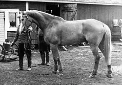 Reipas was foaled in 1948 in Kortesjärvi, bred by Lauri Ylikoski.[5][6] He was originally named Poju.[6] Poju was intended to become a working horse, and was accordingly gelded.[6] Soon afterwards, he was sold to Paavo Kontiainen from Evijärvi for 20,000 Marks, and Kontiainen then sold him in the Kokkola market.[3] Poju was resold a few times more, always for a higher price, until he was bought by smallholder Aapeli Miettinen's son Väinö for 38,000 Marks.[3][6] By then, Poju was three years old, and very thin and weak.[3][6] The father wondered aloud why Väinö had bothered to bring such a "fur purse" all the way from the city.[3] However, on good pasture, the barely walking Poju's condition soon improved, and Aapeli Miettinen traded him from his son for a five-year-old mare and 10,000 Marks. The now lively gelding was renamed Reipas ("Brisk").[3][6]