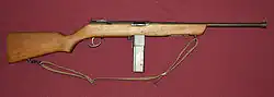 From the submachine gun the .30 carbine light rifle prototype was developed, it was competing to become the M1 carbine but lost to Winchester. While sharing many parts with the submachine gun the light rifle uses a gas piston, it was built in semi-automatic and fully automatic versions and issued with a 12-round magazine.[12][13][14]
