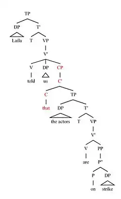 There are two separate phrasal heads that relativizers can occupy. Cross-linguistically, relativizers may occupy either the head of a complementizer phrase (C-Type Relativizer) or the head of a determiner phrase (D-Type Relativizer). C-Type Relativizers can introduce a relative clause as an argument of a noun phrase, or they can introduce a relative clause as an argument of a verb phrase. D-Type Relativizers may only introduce a relative clause as an argument of a noun phrase. English is a language which uses a C-Type Relativizer, that, as a part of its relativization strategy because "that" can introduce a relative clause as either the argument to a Noun Phrase or the argument to a Complementizer Phrase. The following examples from English shows the same morpheme being used in both syntactic contexts.[9]