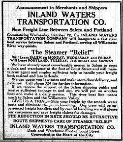 On October 19, 1924, the Inland Waters Transportation Company announced that it would inaugurate steamboat service, using Relief, running on the Willamette River from Salem to Portland.[34] Relief was to depart Salem for Portland at 6:00 a.m. every Wednesday, Friday, and Monday, and return to Salem on Tuesdays, Thursdays, and Sundays.[34] Capt. Fritz Kruse was to have command of Relief.[34] Robert Kerns was to be the chief engineer.[34] Freight alone would be carried, and no passengers.[34] To receive freight, the company had built a warehouse in Salem at the intersection of Court and Water streets.[34]