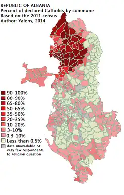 In the 2023 census, about 8.38% of Albania's population were declared as Catholic Christianity.[2] Albania once numbered eighteen episcopal Sees, some of them having uninterrupted activity from the dawn of the Catholicism until today. The country has been a Catholic bridgehead in the Balkans, with Catholic Albanians playing a role not unlike the Croats in the former Yugoslavia. In the Middle Ages, Albania was ruled by many Catholic rulers, including natives but notably the Angevins and it became a site of the spread of Catholicism in the Balkans at the expense of Orthodoxy as previously Orthodox Albanian nobles and their subjects converted as they grew increasingly loyal to the Western powers as a way to fend off threats coming from Orthodox political entities. Despite the ascendance of Catholicism at the time, Orthodox minorities remained. Before long, Durrës and Kruja became major centers of Balkan Catholicism, and in 1167 it was a significant event when Kruja became a Catholic bishopric, with the new bishop consecrated by the Pope himself.[86] Vlora and Butrint also saw Catholicization, and at the peak of Catholic power in the Balkans with Albania as a stronghold, Catholic structures began appearing as far afield as Skopje in 1326.[87] At the end of the 14th century, the previously Orthodox Autocephalous Archbishopric of Ohrid was dismantled in favor of the Catholic rite.[36]