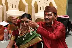Elements of a traditional Marathi Hindu wedding ceremony include seemant poojan on the wedding eve. The dharmic wedding includes the antarpat ceremony followed by the vedic ceremony which involves the bridegroom and the bride walking around the sacred fire seven times to complete the marriage. Modern urban wedding ceremonies conclude with an evening reception. A Marathi Hindu woman becomes part of her husband's family after marriage and adopts the gotra as well as the traditions of her husband's family. After weddings and after thread ceremonies, many Maratha and Deshastha Brahmin families arrange a traditional religious singing performance by a Gondali group.[16] Women from Hindu community are given a neckless called mangalasutra during the wedding ceremony by the groom. This is worn as a symbol of marriage by women throughout their married life.[17][18]