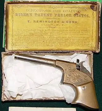 The Remington-Rider Single Shot Derringer Parlor Pistol was made by E. Remington and Sons between 1860 and 1863. Only two hundred were produced.