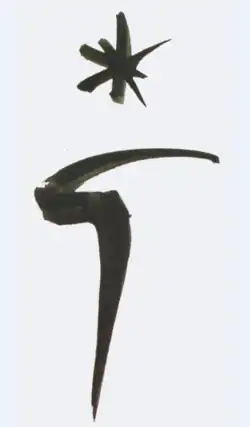 Gruau died on 31 March 2004.[1] His ashes rest in the Monumental Cemetery of Rimini, where his funerary monument consists of a mosaic of a stylised woman's face on white marble floor circle, with a bronze stele emerging vertically from the marble,[9][10] containing Gruau's signature and surmounted by an asterisk. The monument was designed by architect Pier Luigi Foschi and artist Vittorio d'Augusta,[10] and resides by the cemetery's entrance, in symmetry with the funerary monument of Federico Fellini.[10][11] Gruau's ashes and those of his son were inaugurated behind the monument on 31 March 2009,[10][12] having previously been buried at a different location in the cemetery.[12][13]