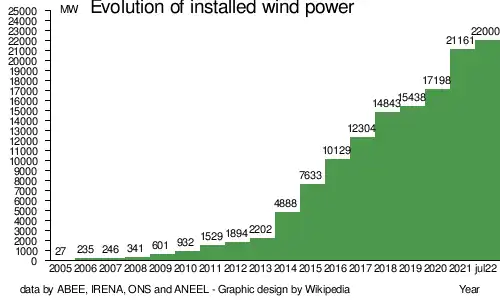 14. ^ "Brasil atinge 21 GW de capacidade instalada de energia eólica" (in Brazilian Portuguese). Valor. 21 January 2022. Retrieved 5 March 2022.