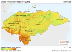 According to an IEA-PVPS estimate Honduras generated just over 12% of its total electricity demand from solar power during 2015.[15] This means that in just one year the country has leapfrogged previous rankings to become first in the world for PV power penetration at that time.[15] In 2015, Honduras ranked as the second largest producer of solar electricity in Latin America (behind Chile, but ahead of Mexico). Honduras has a large potential for solar photovoltaic generation. In fact, it is a practical solution for servicing energy-isolated rural communities. In 2007, there were about 5,000 individual Solar Home Systems, with an average size between 30 Wp and 50 Wp, which makes up for a total capacity of approximately 15 to 25 kW of power.[1] The government utility, Empresa Nacional de Energía Eléctrica (ENEE), offered 20-year guaranteed contracts for utility scale solar farms. This resulted in 23 solar farms being approved in 2014 for a total of 609MW and will represent an investment of 1.6 billion US dollars.[16] The ten parks totaling 300MW which came online by July 31, 2015 got a bonus.[17]
