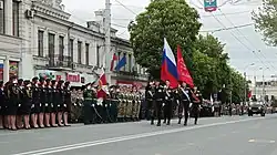 On 11 April 2014, the parliament of Crimea approved a new constitution, with 88 out of 100 lawmakers voting in favor of its adoption.[42] The new constitution confirms the Republic of Crimea as a democratic state within the Russian Federation and declares both territories united and inseparable. The Crimean parliament would become smaller and have 75 members instead of the current 100.[43] According to the Kommersant newspaper, the authorities, including the State Council chair Vladimir Konstantinov, unofficially promised that certain quotas would be reserved for Crimean Tatars in various government bodies. On the same day, a new revision of the Russian Constitution was officially published, with the Republic of Crimea and the federal city of Sevastopol included in the list of federal subjects of the Russian Federation.[44]