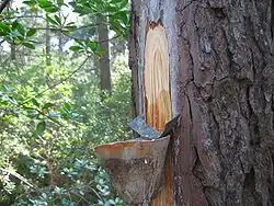 Resin extraction consists of incising the outer layers of a pine tree in order to collect the sap or resin.
