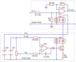- ^ The original schematic had a common ground wire for audio and control networks. Here, grounds are split to demonstrate full galvanic isolation. The original Silonex circuit used dual supply rails to power OA2. If the inputs of OA2 allow rail-to-rail operation, it can powered with a single positive rail Vcc, and the same rail can double as reference voltage (Vref=Vcc). It need not be precisely regulated.