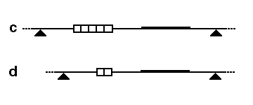 In the third schematic, the probe and restriction enzyme are chosen to detect a region of the genome that includes a variable number tandem repeat (VNTR) segment (boxes in schematic diagram). In allele c, there are five repeats in the VNTR, and the probe detects a longer fragment between the two restriction sites. In allele d, there are only two repeats in the VNTR, so the probe detects a shorter fragment between the same two restriction sites. Other genetic processes, such as insertions, deletions, translocations, and inversions, can also lead to polymorphisms. RFLP tests require much larger samples of DNA than do short tandem repeat (STR) tests.