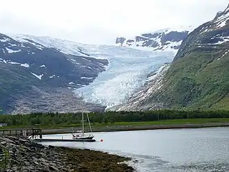 Engabreen Glacier in Norway, an outlet glacier of the Svartisen ice cap, had several advances in the 20th century, though it retreated 200 m (660 ft) between 1999 and 2014.[56] Brenndalsbreen glacier retreated 56 m (184 ft) between 2000 and 2014, while the Rembesdalsskåka glacier, which has retreated 2 km (1.2 mi) since the end of the Little Ice Age, retreated 200 m (660 ft) between 1997 and 2007.[57] The Briksdalsbreen glacier retreated 230 m (750 ft) between 1996 and 2004 with 130 m (430 ft) of that in the last year of that study; the greatest annual retreat recorded on that glacier since studies began there in 1900.[58] This figure was exceeded in 2006 with five glaciers retreating over 100 m (330 ft) from the fall of 2005 to the fall of 2006. Four outlets from the Jostedalsbreen ice cap, the largest body of ice in continental Europe, Kjenndalsbreen, Brenndalsbreen, Briksdalsbreen and Bergsetbreen had a frontal retreat of more than 100 m (330 ft).[59] Overall, from 1999 to 2005, Briksdalsbreen retreated 336 metres (1,102 ft).[59] Gråfjellsbrea, an outlet glacier of the Folgefonna ice cap, had a retreat of almost 100 m (330 ft).[59]