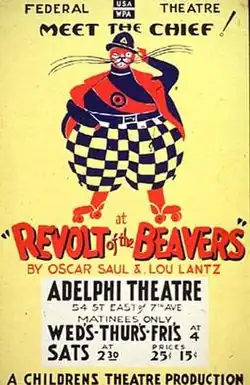 Revolt of the Beavers was a children's play put on by the Federal Theater Project by Oscar Saul and Louis Lantz. It was originally directed by Peter Hyun, but he was replaced when his actors refused to go Broadway with him, insisting on a name director.[1] One critic described the play as "Marxism à la Mother Goose".[2] The show ran at the Adelphi Theatre in New York City from May 20, 1937, to June 19 of that year.[3] Jules Dassin[4] and John Randolph[5] were among the play's cast. The play involved a worker beaver named Oakleaf, who leads a revolt against "The Chief" Beaver who was exploiting the workers. Though the play was a fantasy fable intended for children, it was attacked by the HUAC for promoting Communist ideals.