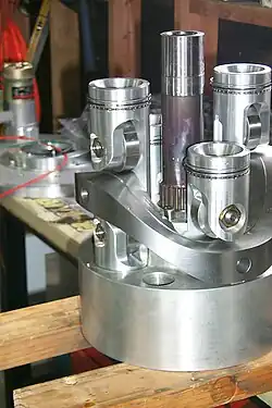 Most revolving cylinder, axial piston engine designs utilize a fixed, multi-lobed barrel-type cam and rollers on the pistons to control the reciprocating movement of the pistons.[1] The benefit of this approach, versus a conventional crankshaft-and-connecting-rod mechanism, is that the kinematics of the piston motion can be optimized with regards to combustion cycle efficiency.