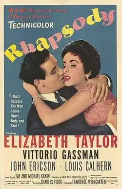 Rhapsody is a 1954 American musical drama film directed by Charles Vidor and starring Elizabeth Taylor, Vittorio Gassman, John Ericson, and Louis Calhern based on the 1908 novel Maurice Guest by Henry Handel Richardson.