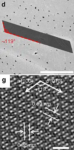 - ^ a b Jiang, Shaolong; Hong, Min; Wei, Wei; Zhao, Liyun; Zhang, Na; Zhang, Zhepeng; Yang, Pengfei; Gao, Nan; Zhou, Xiebo; Xie, Chunyu; Shi, Jianping; Huan, Yahuan; Tong, Lianming; Zhao, Jijun; Zhang, Qing; Fu, Qiang; Zhang, Yanfeng (2018). "Direct synthesis and in situ characterization of monolayer parallelogrammic rhenium diselenide on gold foil". Communications Chemistry. 1. doi:10.1038/s42004-018-0010-6.