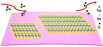 Rhenium diselenide with a thickness as small as a triple-atomic layer can be produced by chemical vapor deposition at ambient pressure. A mixture of Ar and hydrogen gases is flown through a tube whose ends are kept at different temperatures. The substrate and ReO3 powder are placed at the hot end which is heated to 750 °C, and selenium powder is located at the cold end which is kept at 250 °C.[4]