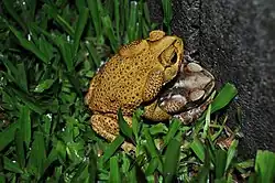 Rhinella icterica is relatively large, stout-bodied toads. Males measure 100–166 mm (3.9–6.5 in) and females 135–190 mm (5.3–7.5 in) in snout–vent length. The parotoid glands are strong, as are the cephalic crests. The dorsum is yellowish in females and juveniles, with a light midline stripe and a regular pattern of black blotches; in the males the colouration is often a bright greenish yellow, with only a few black blotches. The belly is white and marbled with brown. The skin is scattered with blunt, thorny warts, especially in the males.[3] Rhinella icterica is the most common toad species found in southeastern Brazil and preys on the yellow scorpion (Tityus serrulatus). It has been observed that Rhinella icterica possess the ability to eat scorpions without adverse effects on the toad.[5] This may be due to Rhinella icterica toxic secretion (RITS) that ultimately acts as a concentration independent irreversible neuromuscular blockade. In the presence of the acetylcholinesterase enzyme there was inhibition of Rhinella icterica toxic secretion. Additionally, RITS acts as an inhibitor on the cardiac Na+, K+-ATPase pump. Scientists have concluded that the toxic secretion from the toad acts as an inhibitor of calcium pumps in the heart causing a twitching action, AChE, and Na+, K+-ATPase pump.[6] This toad species has been found to possess a defense mechanism against predators. There are cutaneous glands that are scattered all over the body of amphibians that aide in respirating, water balance, and chemical defense. There are 2 types of glands: mucous and poisonous. The poisonous glands involved in the defense mechanism are called granular glands. They form glandular accommodations in the dorsal region behind the eyes, one on each side of the body. These are called the paranoid macroglands. When they are threatened, they inflate up their lungs and point one of the glands at the attacker. This opens one of the glands to attack. When this region is pressed upon, poison is rapidly released. If bitten, the poison is shot into the predator's oral cavity mucosa, thus poisoning them.[7]