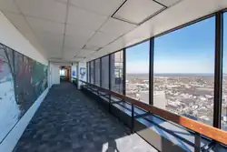 The tower's 40th floor contains an observation deck, providing an unobscured panoramic view of Columbus, accessed by a 28-second elevator ride. The attraction is free to the public, requiring only photo IDs in order for lobby staff to grant visitor badges. The floor-to-ceiling viewing windows are located on the north, east, and south sides of the building, and on clear days they give views past the Columbus metropolitan area. Signs by the windows identify notable buildings and sights.[6][38] When the building opened, the deck wrapped around all four sides of the building, though it was altered to allow for more office space on the floor. It is nevertheless one of few observation decks remaining open to the public; areas in the Leveque Tower and One Nationwide Plaza are no longer accessible.[39]