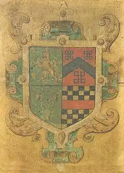 ARMS – Quarterly, 1st, Sable (black), a lion rampant within an orle of cinquefoils Or (gold); 2nd, Gules (red), a chevron Or (gold), between three bowers' knots; 3rd, Sable (black), three buck's heads cabossed Argent (silver); 4th, chequy Or (gold) and Sable (black), a fess Argent (silver).