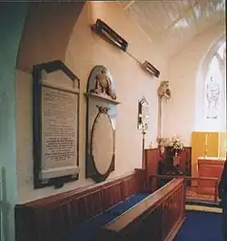 The two memorials (Pictured at right) are attached to the wall behind the family's front pew in the church. A number of the family are interred in the family vault, which lies beneath the floor under the pew.[17] Captain David John Edwardes 1787–1866 and his son Captain Frederick Augustus Edwardes 1829–1878 are buried in the churchyard behind the church.
