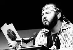 After publishing his work in an edited anthology, Sánchez received a prestigious Frederick Douglass journalism fellowship.[9] In 1970, he was accepted into the doctoral program at Union Institute & University. He received his PhD in American Studies in 1974 and received a tenure track faculty position at Washington State University.[10] While teaching at Washington State, Sánchez continued publishing his work to great acclaim. His collection Hechizospells (1976) was praised as "awesome in its sweep and profundity about the human condition."[11] The poet Maya Angelou described his work: “Ricardo Sanchez is like any great poet. He’s at once a preacher, a teacher, a priest, a rabbi. He’s a guru, he’s a master. And because he is that he’s also a rebel. He’s a maverick. Every great teacher is a maverick.”[7] Sánchez' "raging cries for cultural justice" and "startling, angry verse" are often credited as foundational to the fields of Chicano poetry and modern Chicano literature.[6] He died from cancer in 1995 at the age of 54.[12]
