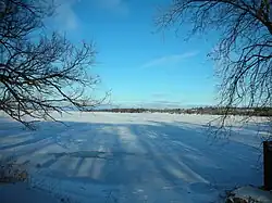 Rice Lake is a lake located in Northumberland and Peterborough counties in south-eastern Ontario. The lake is located south of the city of Peterborough, and the Kawartha Lakes and north of Cobourg. It is part of the Trent-Severn Waterway, which flows into the lake by the Otonabee and out via the Trent. The lake is 28 kilometres (17 miles) long and 5 km wide. Its maximum depth is 10m, with a surface water level at 187 m above sea level, raised to its present height by the Hastings Dam, built in the 19th century as part of the Trent-Severn canal system.[1] The Indigenous Mississaugas called it Pemadashdakota or "lake of the burning plains".[2]
