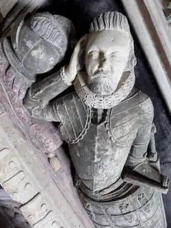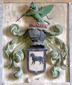 His large monument with semi-recumbent effigy dressed in armour survives in All Hallows Church, Woolfardisworthy. The monument was said in 1978 to retain the original paintwork.[26] The Latin inscription etched onto a slate tablet is largely worn away.[27]