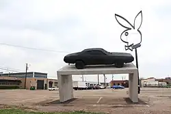 In 2013, he collaborated with Playboy magazine to create a roadside installation near Marfa, Texas; he mounted a black-painted 1970s muscle car on an inclined concrete plinth beside a large symbol from the magazine.[11]