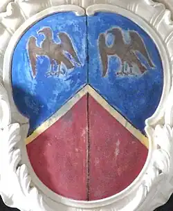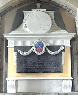 Below is a white marble relief sculpted escutcheon showing the following arms: Quarterly 1st & 4th: Clevland; 2nd & 3rd: Vert, two bars engrailed between three leopard's faces or (Child baronets, of the City of London (1685) (Child of Surat, East Indies and Dervill, Essex, Baronet, created 1684, extinct 1753),[12] the arms of William Clevland's mother Elizabeth Child). Overall is an inescutcheon of pretence of Stevens: Per chevron azure and gules, in chief two falcons rising belled or.