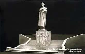 The first efforts to erect a Wagner monument in Leipzig date back to 1883. For his 70th birthday, three months after his death, a committee collected donations and considered locations for a memorial. After a few unsuccessful drafts, a memorial committee under Mayor Bruno Tröndlin (1835–1908) appealed to the Leipzig public in 1903 for donations and won the then most famous Leipzig artist, Max Klinger, for the execution. A first draft envisaged a 4 metres (13 ft) tall figure of the composer made of white marble, encased in a long, black coat made of heavy fabric, which was to stand at the Old Theater. The work on it was already in until the purchase of the marble block from Laas, South Tyrol, was thriving when, in 1911, Klinger submitted new plans to the then mayor, Rudolf Dittrich (1855–1929). Now a 5.3 metres (17 ft) tall Wagner figure was to be placed on a 3 metres (10 ft) tall pedestal with reliefs on the stairs between Fleischerplatz and Matthäikirchhof. Otto Wilhelm Scharenberg (1851–1920) extended this staircase according to Klinger's plans, and on the composer's 100th birthday in 1913, when the monument was supposed to be finished, the foundation stone was laid on the staircase at the site of today's monument. After that, nothing changed there for a long time.[7] Klinger sent the plaster models for the reliefs to Laas to be transferred to the marble pedestal and had a second large block broken up for the marble statue. The outbreak of World War I, financial difficulties and finally Klinger's death in 1920 prevented progress. The pedestal came to Leipzig in 1924 and was erected in the Klingerhain, the southern part of the Palmengarten, after being reworked by the Leipzig sculptor and Klinger's heir, Johannes Hartmann (1869–1952). It stood here for over 80 years, sometimes also referred to as the “porn cube” because of the naked Rhinemaidens.[4]