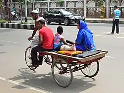 The rickshaw van, similar to a cycle rickshaw, features a flat wooden platform in place of a seat for transporting goods or as a mobile market stall, though it is occasionally used for passengers.[19][13] These vehicles are most prevalent in suburban areas. The most common design configuration comprises two rear wheels and a steerable front wheel. The main chassis, constructed from mild steel angle bar, is connected to a frame made of thin-walled steel tubing arranged in triangles for strength and proper alignment.[20] The electric version of these vans are widely used in smaller cities and rural areas.[13]
