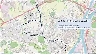 Downstream of Bériwa, after the Moulin Nozé, the Rida split into two. The main course was diverted through the current location of rue Laixheau and flowed toward Place Licour. During storms, part of the stream ran in its original course, via Rue Faurieux,[13] where the vault of the passage under an old railroad line is still visible.