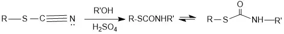 The mechanism for the conversion of an alcohol to the N-substituted thiocarbamate is shown below.[4] The reaction proceeds under acidic conditions. The alcohol accepts a hydrogen ion from sulfuric acid to form a water, which then leaves, creating a carbocation. The mesomeric form of the cyanogroup reacts with the carbocation. The carbocation is attacked by a water, which then loses a hydrogen to form the product. The product then undergoes hydrolysis to form the N-substituted thiocarbamate.