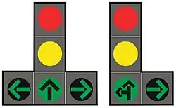 In Slovenia, the same sign as in Germany is used,[62] where vehicles can turn right on a red light at all times, but they don't have the right of way. Some intersections also have a green arrow light, that is lit when right turns are allowed.[63][64] Historically, a different sign with the same meaning was used in the nineteen sixties, a green curved arrow on a small white rectangle board, attached under a traffic light.[65][66]