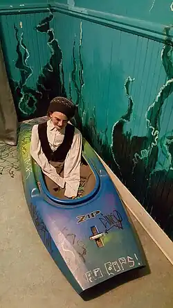 According to the owner, each table is named after a different composer and has a "pseudo elegant" decor.[1][14] Some of the tables are "haunted" (animated), at times rotating or vibrating; one rises 18 inches (46 cm) every 45 minutes, returning to its original position after moving through a succession of different heights.[4][8][14] The table named for Sergei Rachmaninoff shakes when a button in the kitchen is pressed, and the Stephen Sondheim table disappears completely through a slit in the wall.[14] Couches are also available for lounging.[6] The upstairs unisex bathroom has an "under-the-sea" theme and reportedly "regularly induces screams".[8][14]