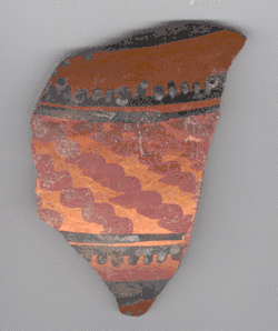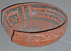 Eckert (2003, 2006) breaks this pottery into two types. She uses "Pottery Mound Polychrome" to describe A rim bowls slipped yellow to buff on the interior surface and red on the exterior surface, and dates the type from AD 1375 to 1450 or later. She uses "Hidden Mountain Polychrome" for A or C rim bowls are slipped red on the interior surface and white on the exterior surface, and dates the type from AD 1400 to 1450 or later. By her standards, the bowl sherd with a C rim shown here is Hidden Mountain Polychrome, not Pottery Mound Polychrome.
