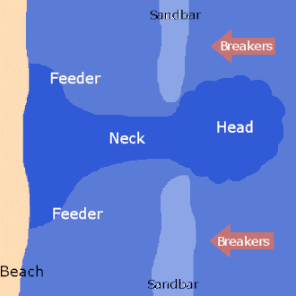 Water that has been pushed up near the beach flows along the shore towards the outgoing rip as "feeder currents". The excess water flows out at a right angle to the beach, in a tight current called the "neck" of the rip. The "neck" is where the flow is most rapid. When the water in the rip current reaches outside of the lines of breaking waves, the flow disperses sideways, loses power, and dissipates in what is known as the "head" of the rip.