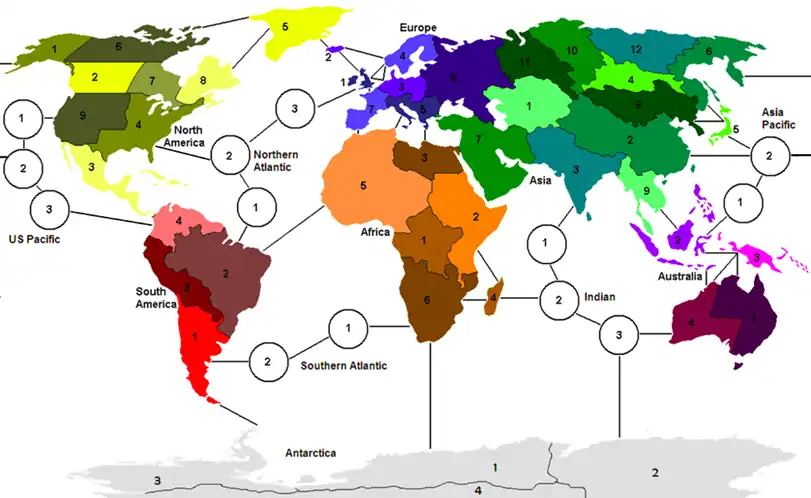 Geographically, the map is nearly identical to the classic Risk map. It has the same forty-two territories as before, but they have somewhat different names; Greenland, for example, is now the Exiled States of America. There is a tendency for large territories to be given the name of a present-day microstate (Andorra, Djibouti, Hong Kong, and Lesotho). Additionally, a few connections are removed from the Earth board that are present in classic Risk board; the picture shows that Egypt is the only African country to have a connection with Middle East.
