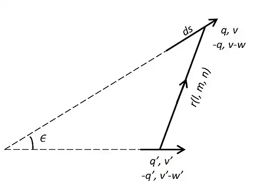On the assumption of an emission theory, the force acting between two moving charges should depend on the density of the messenger particles emitted by the charges (), the radial distance between the charges (ρ), the velocity of the emission relative to the receiver, ( and for the x and r components, respectively), and the acceleration of the particles relative to each other (). This gives us an equation of the form:[3]